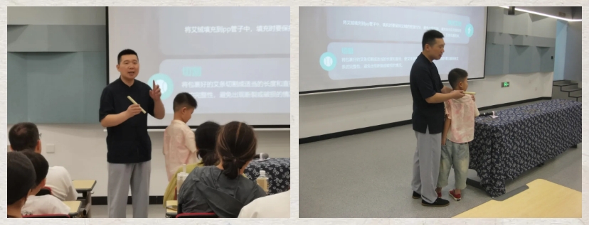 课堂上,老师通过生动的图片和语言向大家科普艾灸的品种、鉴别方法、功效等知识,激发了孩子们的浓厚兴趣。随后同学们进行了手工搓艾条体验,孩子们将艾绒放置到卷艾条机内,卷成长条状,并用桑皮纸包裹,封口成圆柱形从而制成艾条。在这个环节中,从挑选艾叶、研磨、卷制到最后的切割,每一步都充满了传统文化的韵味,学生们不仅学习了中医养生知识,也感受到了手工制作的乐趣,体验到了齐心协力的快乐。此外老师还通过现场艾灸培训讲解和现场实操体验相结合的模式,为大家普及艾灸保养知识,提升他们的艾灸实践能力。