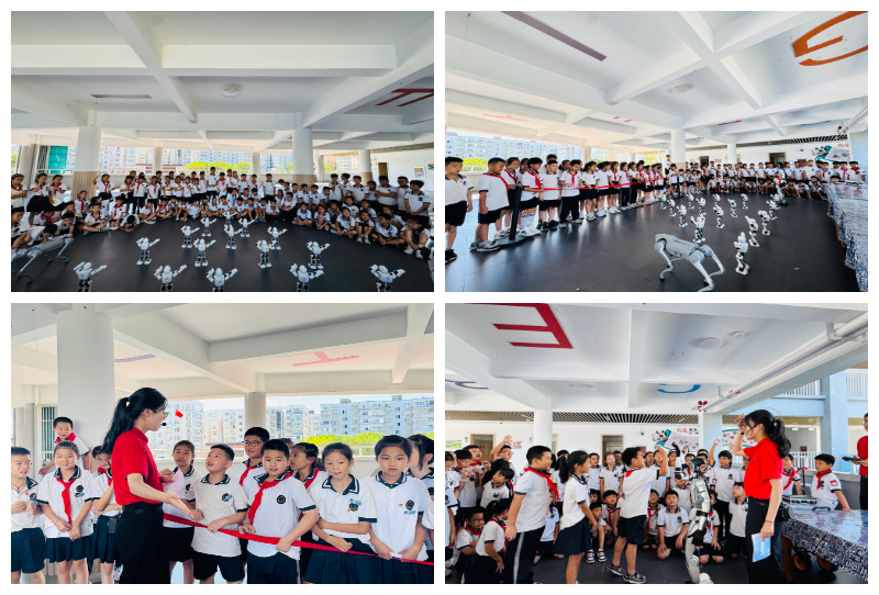 人形机器人互动环节更是将现场气氛推向高潮,机器人与同学们进行拥抱、击掌和握手等动作,展示了现代人工智能技术的高度发展。最受孩子们欢迎的当属机器狗互动环节,智能机器狗灵活地行走、翻滚、作揖,与学生们亲密互动,让孩子们在欢声笑语中感受科技的魅力。