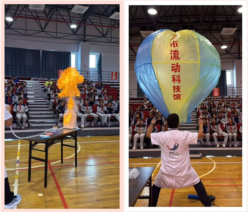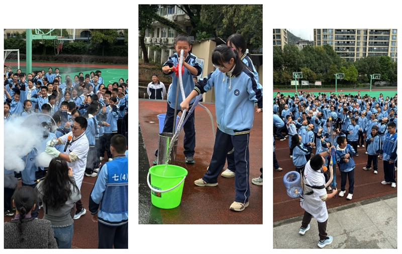 紧接着,一系列精彩纷呈的实验轮番登场。液氮吹喇叭、液氮喷雾带来的“仙境”效果,让同学们仿佛置身于科幻电影现场;乒乓球机关炮和酒精冲天炮则直观展示了气压与燃烧反应的强大能量;“最早的水泵”实验仅用一根管子和一桶水,便让同学们亲眼见证了古人智慧的结晶,感受到科学源于生活的真谛。田老师用他那生动有趣的语言和精准的操作技巧,将复杂的科学原理变得通俗易懂,让学生们在轻松愉快的氛围中掌握了科学知识。