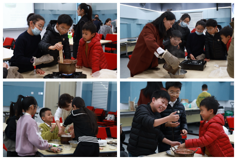 活动伊始,老师为大家讲解了豆制品中富含的优质蛋白与钙质等营养知识,为实践环节打下科学基础。随后进入动手环节——孩子们化身“小小豆腐匠”,亲手熬煮提前磨好的豆浆。当滚烫的豆浆与卤水相遇时,所有人屏息注视,在轻轻搅拌中,亲眼见证了豆浆凝结成豆花的奇妙变化。老师适时解说:“卤水的主要成分是氯化镁或硫酸钙,作为传统的食品凝固剂,它能促使豆浆中的蛋白质发生胶凝,这是古人智慧与化学反应的共同作用。”
