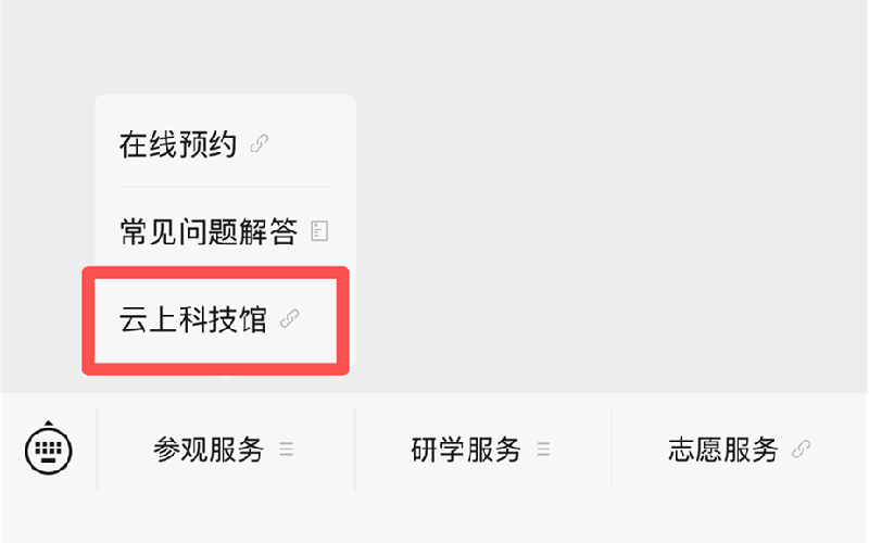 方式一:手机端可以通过公众号左下角“参观服务”中的“云上科技馆”点击进入。