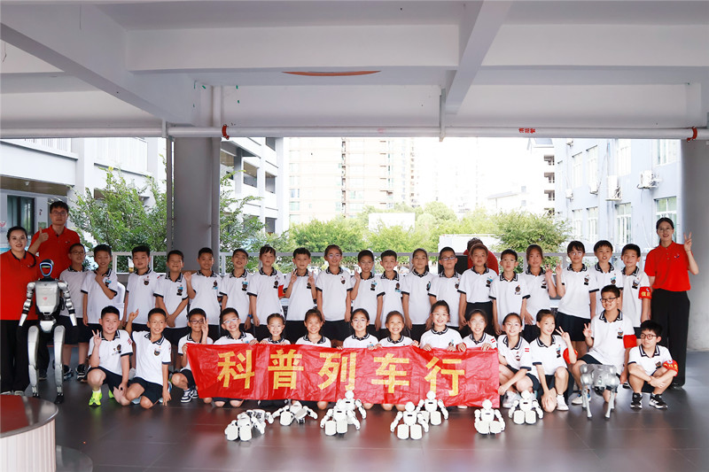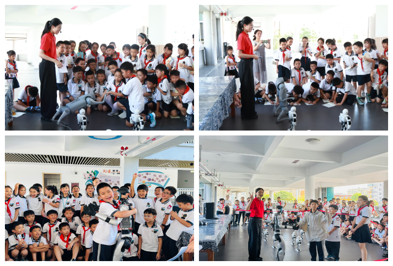 人形机器人互动环节更是将现场气氛推向高潮,机器人与同学们进行拥抱、击掌和握手等动作,展示了现代人工智能技术的高度发展。最受孩子们欢迎的当属机器狗互动环节,智能机器狗灵活地行走、翻滚、作揖,与学生们亲密互动,让孩子们在欢声笑语中感受科技的魅力。