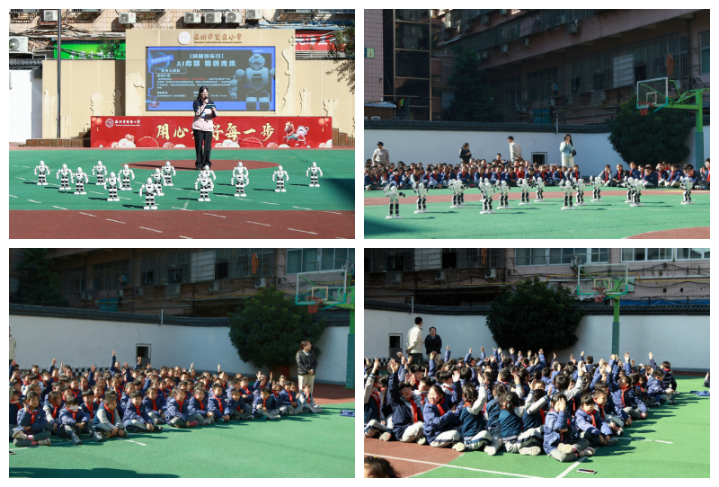 伴随着《青春修炼手册》轻快的前奏,一排动作整齐划一的机器人“特工队”闪亮登场。它们的手臂灵活摆动,身体随着节奏精准律动,瞬间抓住了所有同学的目光。而当《dangerous》经典旋律响起,机器人模仿起迈克尔·杰克逊的招牌滑步和侧倾动作时,现场气氛被彻底点燃。“太帅了!”“它们怎么跳得比我还齐!”台下的同学们目不转睛,有的跟着节奏点头,有的情不自禁地模仿起机器人的动作,笑声与赞叹声此起彼伏。