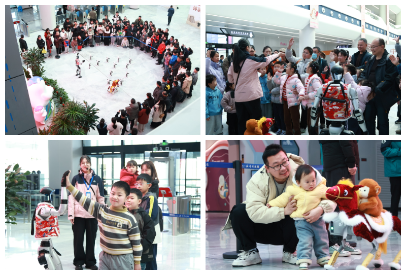 “妈妈快看!机器狗在给我拜年!”在一楼大厅,穿着马年特制服装的机器狗一亮相,瞬间成为全场的焦点。它时而作揖拜年,时而翻滚卖萌,引得小朋友们拍手叫好。一旁的AI智趣问答同样火爆,面对科普辅导员的提问,孩子们争相抢答。当答对问题看到“笨笨”送上热烈的掌声时,小脸儿上洋溢的成就感比手中的新春礼物还要闪亮。