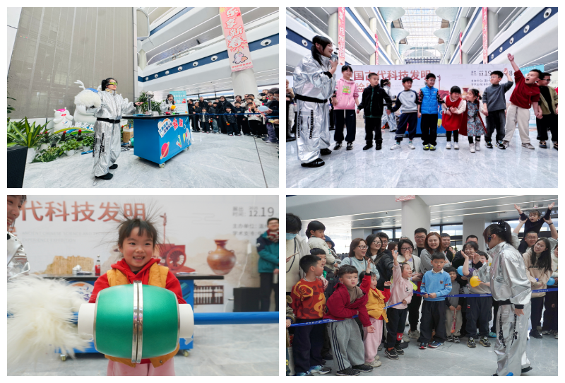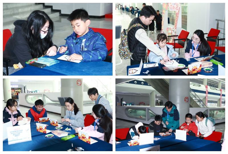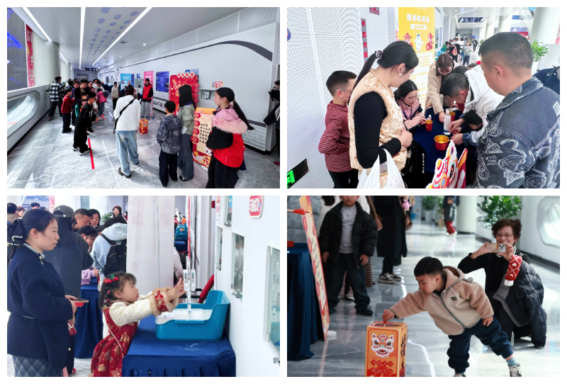 春节期间,二楼的创新成果展示长廊变身亲子家庭的互动乐园,15件移动展项前围满了好奇的小脑袋,大家动手操作,在玩中探索声光力电的奥秘。而“新春欢乐游”区域更是笑声不断。“幸运投壶”区,孩子们瞄准壶口,奋力一掷,将箭精准地投入了壶内;“投针试巧”桌前,全家齐上阵,屏住呼吸,小心翼翼地将回形针浮在水面,当一枚枚回形针成功“漂”起来时,欢呼声此起彼伏;最热闹的当属“趣打年兽”,孩子们排着长队,轮流操作“空气大炮”,随着“砰”的一声,空气涡流精准击中悬挂的“年兽”图案,仿佛真的赶走了传说中的怪兽。